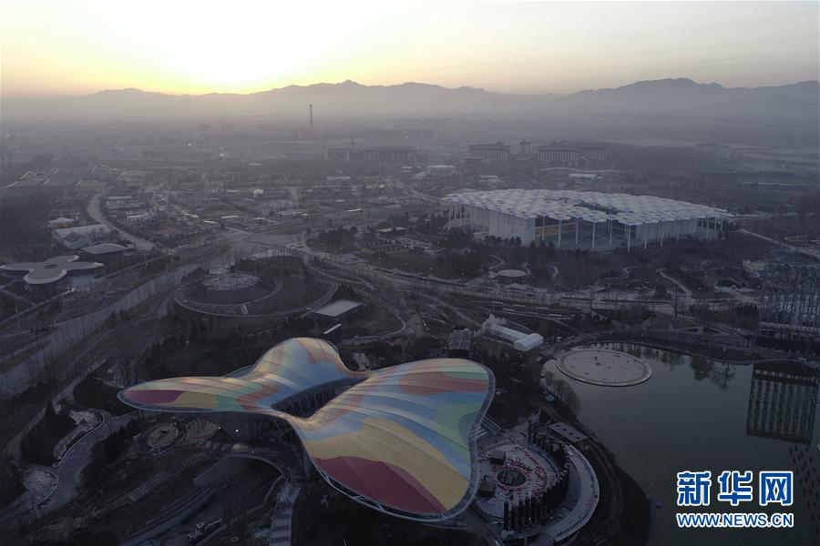 3月27日无人机拍摄的妫汭剧场(左下)和国际馆(右上)。 新华社发(张豪夫 摄)