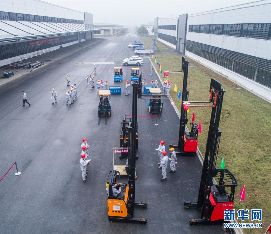 3月29日,技术工人在参加叉车技能比赛(无人机拍摄)。 当日,浙江省杭州市临安区总工会组织的汽车技工技能“大比武”在临安区易辰汽车公司厂区内举行,竞赛内容包括叉车技能、机械臂技能以及电焊技能等。本次活动也拉开了2019年临安区“百千万”(百家企业参与、发现千名优秀员工、万名职工参加)劳动竞赛的帷幕。 新华社记者 徐昱 摄