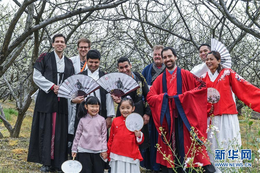 3月31日,外国友人与桐乡当地的汉服爱好者一同身着传统汉服在开满鲜花的槜李园内合影留念。