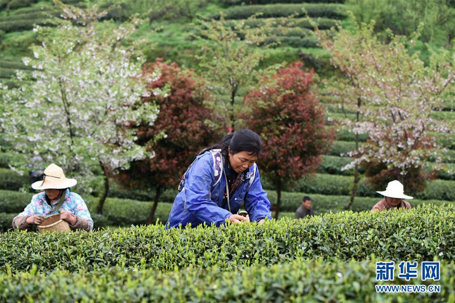3月31日,采茶工在贵州省余庆县松烟镇一处茶场采摘“明前茶”。随着气温回升,贵州省遵义市余庆县各大茶场迎来“明前茶”采摘高峰。采茶工人忙着采摘、制茶,供应市场。新华社记者 杨文斌 摄