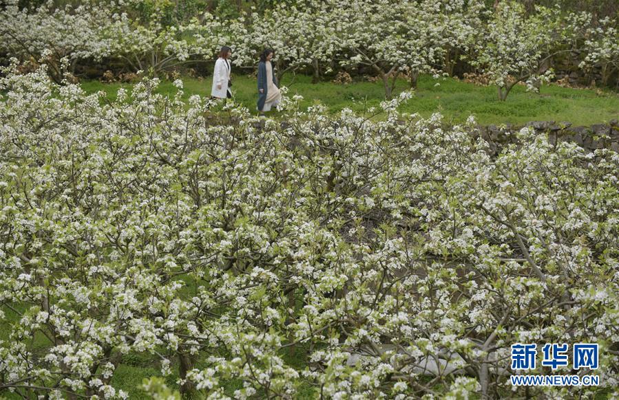 4月1日,游人在湖北宣恩县椒园镇黄坪村的一处梨园内游玩。新华社发(王俊 摄)