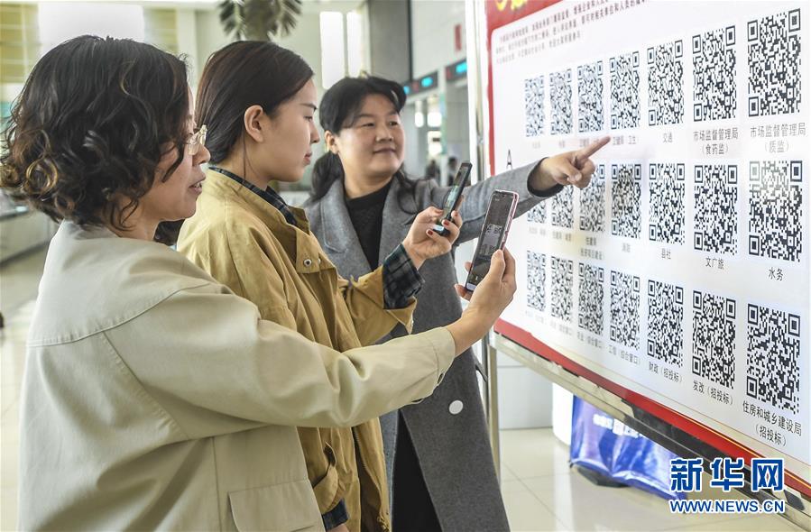 4月1日,在河北省故城县政务服务中心,故城县纪委监委工作人员(右)在指导办事群众扫描二维码进行评议。
