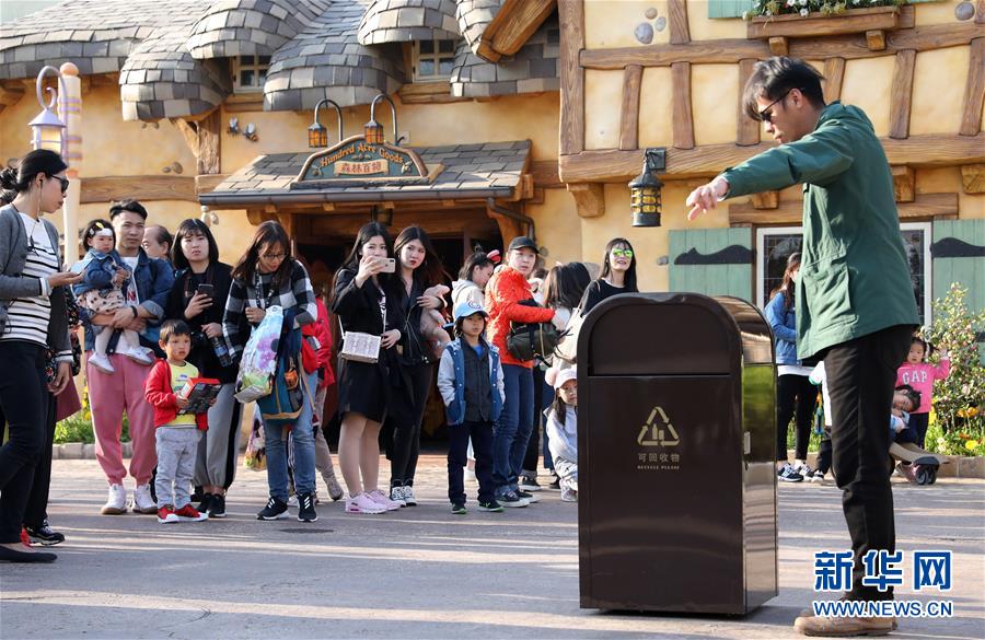 4月1日,园区工作人员(前)引导移动回收站“小推”进入园区与游客见面。新华社记者方喆摄