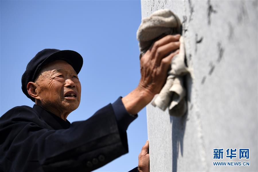 胡兆伦在烈士陵园擦拭墓碑(3月14日摄)。 新华社记者刘军喜摄