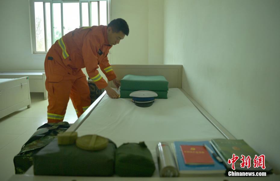 4月3日,四川西昌,一名消防员正在整理牺牲队友徐鹏龙的床。凉山州森林消防支队西昌大队宿舍里依旧是队员们奔赴火场前的模样,只是十分清静。四川凉山州木里县雅砻江镇立尔村3月30日发生森林火灾。3月31日下午,四川森林消防总队凉山州支队指战员在扑火行动中,受风力风向突变影响,突发林火爆燃,大火带走了27名森林消防员的生命,其中西昌大队就有26名。中新社记者 刘忠俊 摄