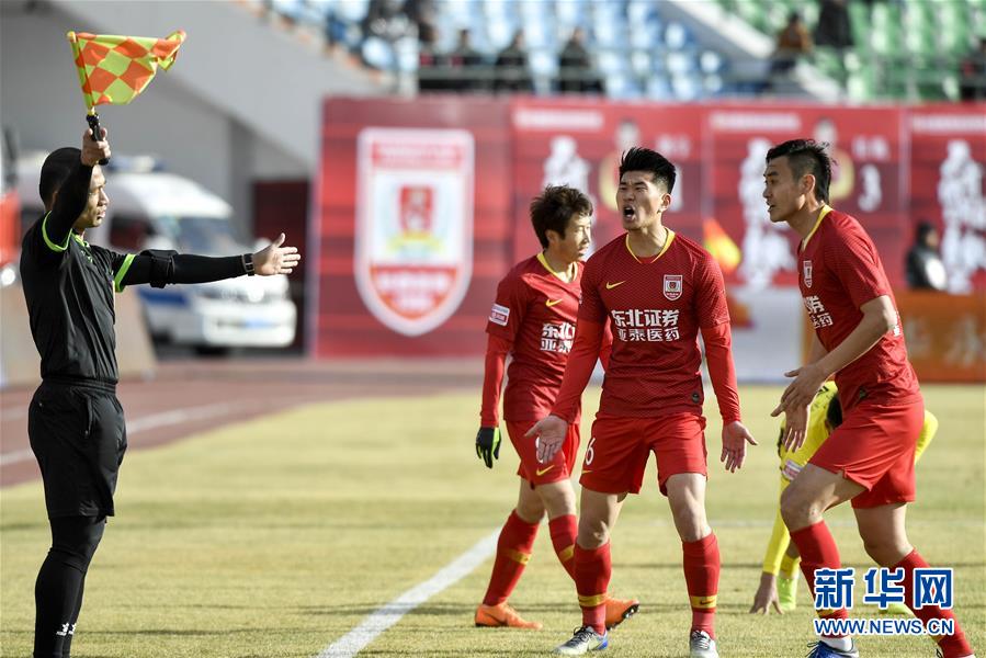 长春亚泰队球员李晓明(右二)不满边裁判罚。新华社记者许畅摄