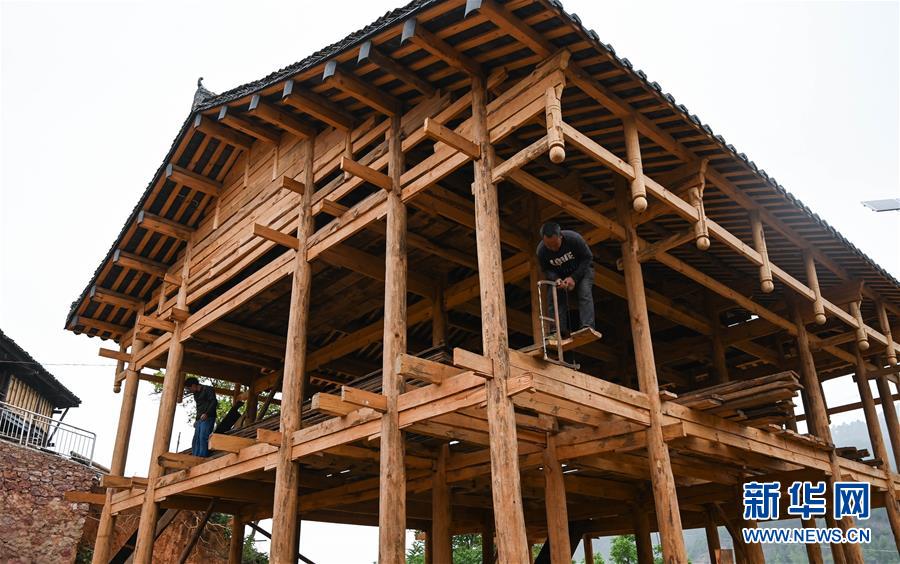 4月7日,板江村村民李天安家在修建具有壮族特色的干栏式建筑。当地群众大多居住在这种民居中。云南省文山州广南县板江村是一座有数百年历史的村落,被列入中国传统村落名录。一直以来,由于该村深居山区,交通不便,脱贫任务艰巨。2017年,村里引入民宿、文创和旅游相结合的新型文旅项目,将当地传统村落的建筑载体、日常习俗、节日庆典、手工技艺等活态文化,转化为优质的文化产品,成为助力乡村脱贫致富的新探索。 新华社记者 江宏景摄