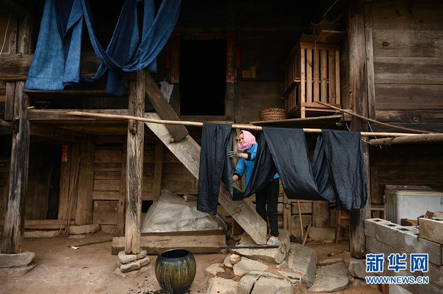 4月7日,板江村村民李乜修在晾晒用草木染过色的麻布。云南省文山州广南县板江村是一座有数百年历史的村落,被列入中国传统村落名录。一直以来,由于该村深居山区,交通不便,脱贫任务艰巨。2017年,村里引入民宿、文创和旅游相结合的新型文旅项目,将当地传统村落的建筑载体、日常习俗、节日庆典、手工技艺等活态文化,转化为优质的文化产品,成为助力乡村脱贫致富的新探索。 新华社记者 江宏景摄