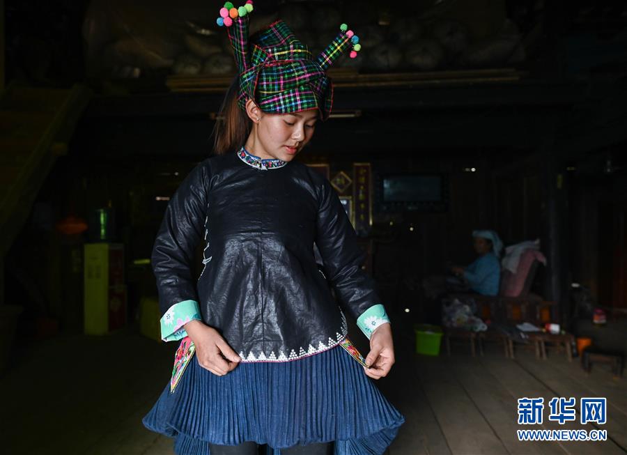 4月6日,板江村村民李广利展示传统的壮族妇女服饰。云南省文山州广南县板江村是一座有数百年历史的村落,被列入中国传统村落名录。一直以来,由于该村深居山区,交通不便,脱贫任务艰巨。2017年,村里引入民宿、文创和旅游相结合的新型文旅项目,将当地传统村落的建筑载体、日常习俗、节日庆典、手工技艺等活态文化,转化为优质的文化产品,成为助力乡村脱贫致富的新探索。 新华社记者 江宏景摄