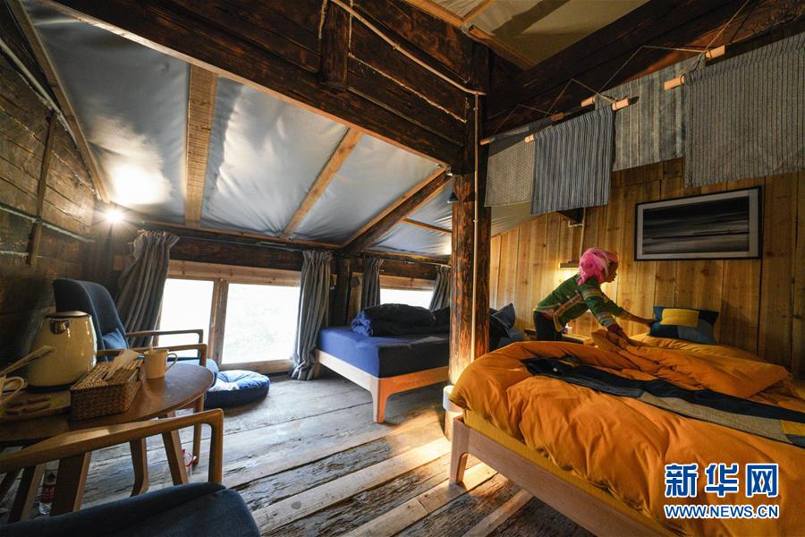 4月7日,板江村村民在一间民宿里整理床铺。云南省文山州广南县板江村是一座有数百年历史的村落,被列入中国传统村落名录。一直以来,由于该村深居山区,交通不便,脱贫任务艰巨。2017年,村里引入民宿、文创和旅游相结合的新型文旅项目,将当地传统村落的建筑载体、日常习俗、节日庆典、手工技艺等活态文化,转化为优质的文化产品,成为助力乡村脱贫致富的新探索。 新华社记者 江宏景摄