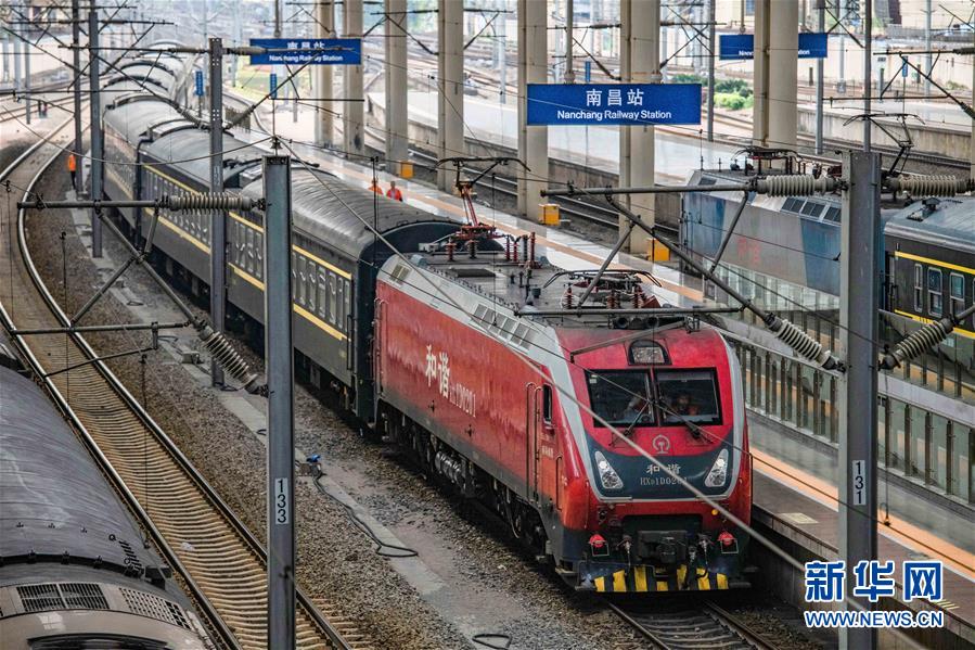 4月9日,一列旅客列车驶入南昌站。4月10日零时起,全国铁路将实施新的列车运行图,优化高铁列车开行方案。 新华社发(鲍赣生 摄)