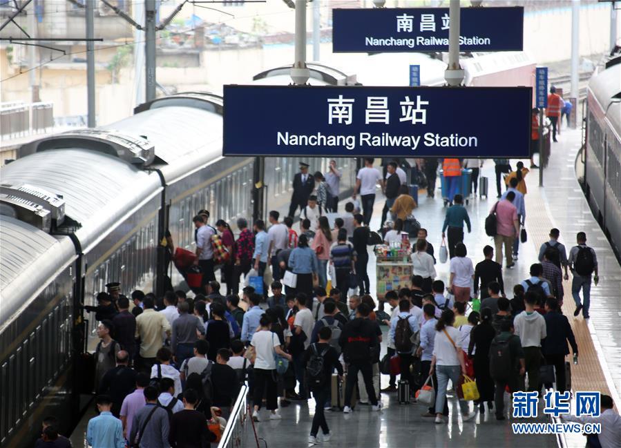 4月9日,旅客在南昌火车站上下车。4月10日零时起,全国铁路将实施新的列车运行图,优化高铁列车开行方案。 新华社发(胡国林 摄)