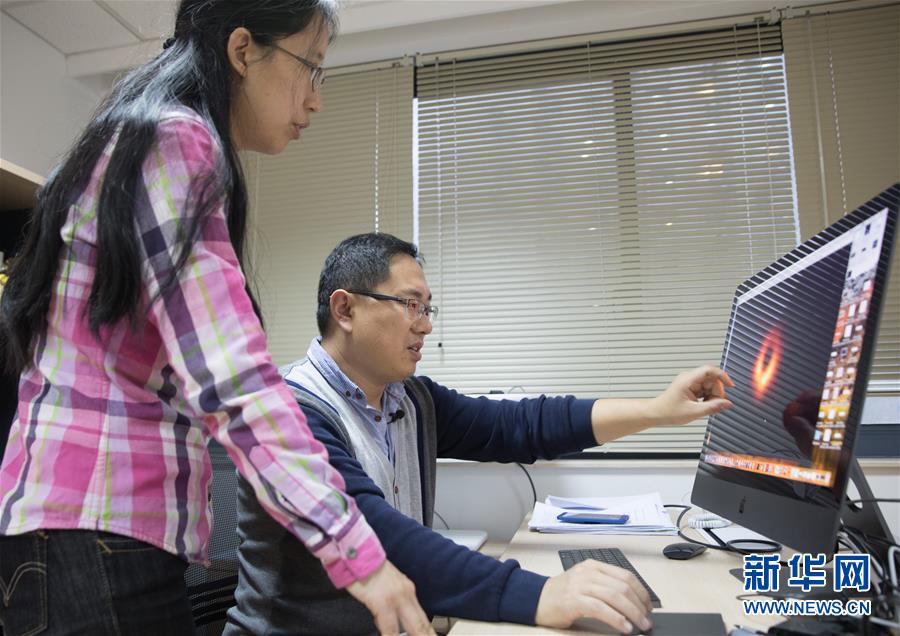 4月9日,在中国科学院上海天文台,路如森研究员(右)和黄磊副研究员在讨论黑洞照片的成像原理。 新华社记者 金立旺 摄