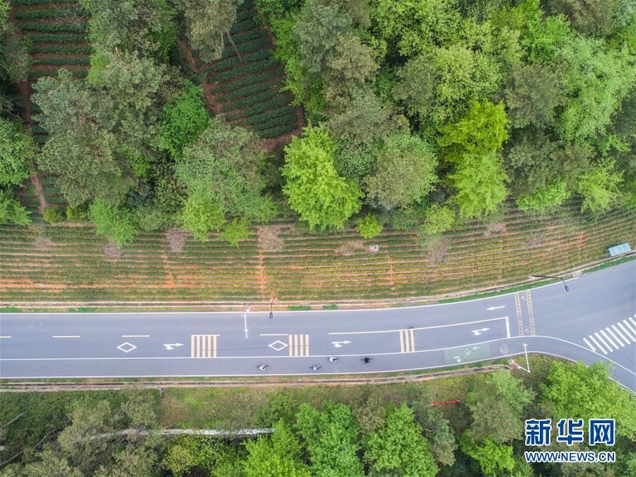 4月10日,游客骑行在安吉县灵峰旅游度假区内竹林间的绿道上(无人机拍摄)。近年来,浙江省安吉县通过建设多条乡村绿道,串联起县内森林公园、历史村落、传统街区等特色区域,打造集茶园、竹园、山地、田园、河流为特色的美丽乡村绿道,方便人们在绿道上骑行和休闲游玩,助力美丽乡村建设和乡村旅游发展。新华社记者 徐昱 摄