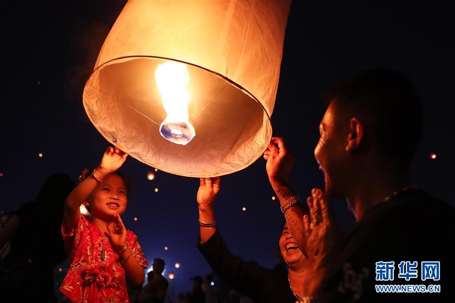 4月13日晚,人们在西双版纳的澜沧江畔放飞孔明灯。当日,为期3天的云南省西双版纳傣族自治州泼水节举行。节日期间,当地将举办划龙舟比赛、燃放孔明灯、泼水狂欢等活动,庆祝傣历新年。 新华社记者 张玉薇 摄