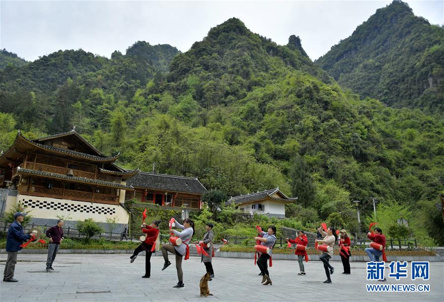 4月14日,湖北省宣恩县长潭河侗族乡两溪河村村民练习打腰鼓。