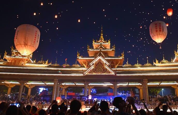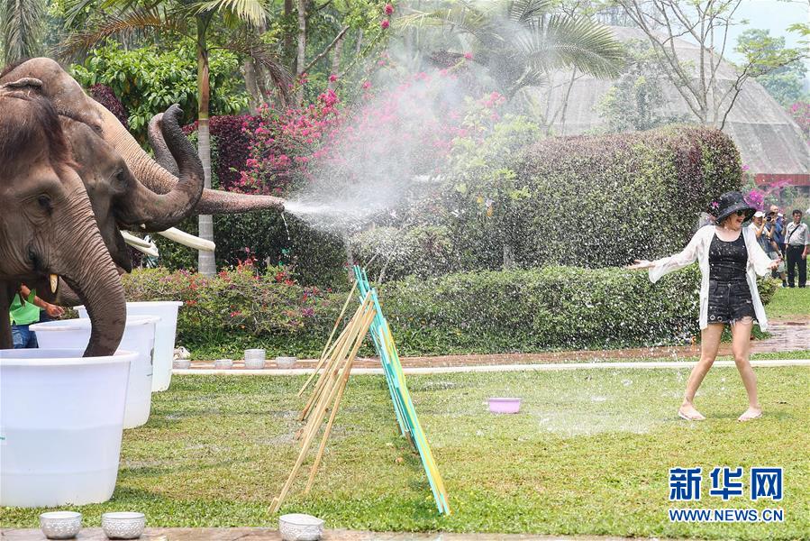 4月14日,在位于云南省西双版纳傣族自治州的野象谷景区,游客参加泼水节活动,庆祝傣历新年。 泼水节于每年4月中旬举行,是泰国、柬埔寨和缅甸等东南亚国家和我国云南、广西等地的传统节日活动。人们用相互泼水的方式互送祝福、传递欢乐。 新华社记者 张玉薇 摄