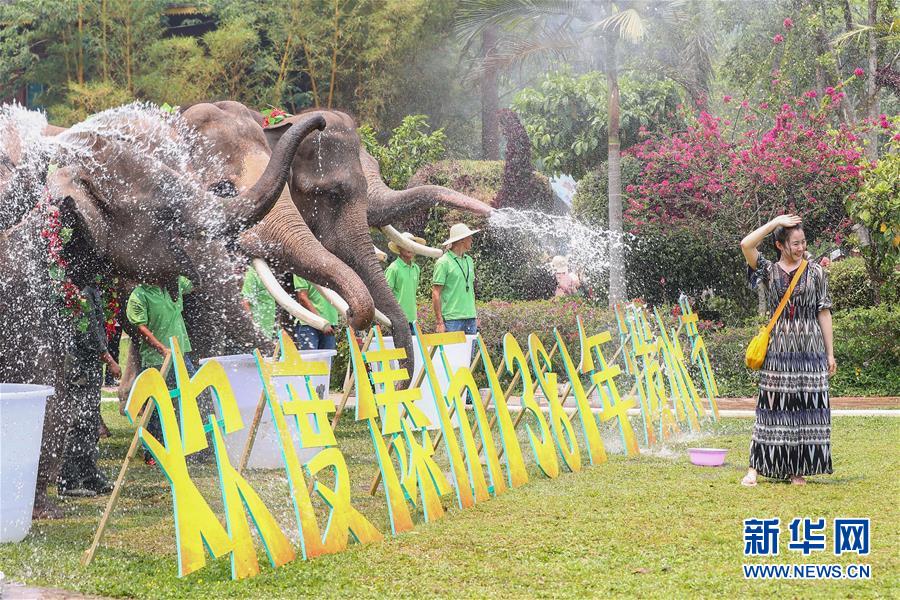 4月14日,在位于云南省西双版纳傣族自治州的野象谷景区,游客参加泼水节活动,庆祝傣历新年。 泼水节于每年4月中旬举行,是泰国、柬埔寨和缅甸等东南亚国家和我国云南、广西等地的传统节日活动。人们用相互泼水的方式互送祝福、传递欢乐。 新华社记者 张玉薇 摄
