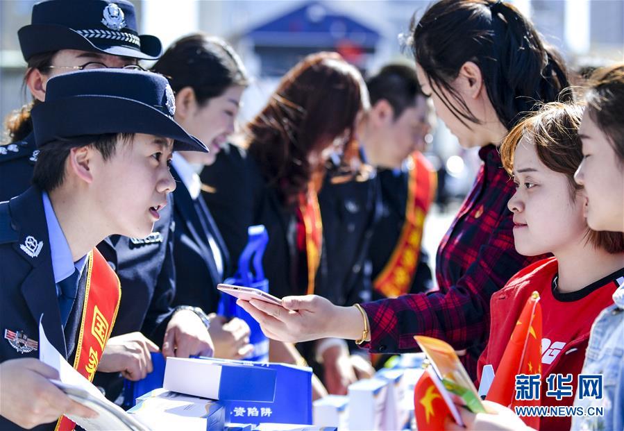 4月15日,在乌鲁木齐时代广场,乌鲁木齐市反电信网络诈骗中心工作人员朱文臻(左)在为前来咨询的市民讲解防诈骗技巧。 当日是第四个全民国家安全教育日,人们通过多种多样的活动,提高国家安全意识,树立“国家安全、人人有责”的观念。 新华社记者 王菲 摄