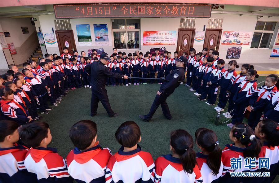 4月15日,河北省邯郸市火磨派出所民警为火磨小学的学生展示公安防暴装备。 当日是第四个全民国家安全教育日,人们通过多种多样的活动,提高国家安全意识,树立“国家安全、人人有责”的观念。 新华社发(郝群英 摄)