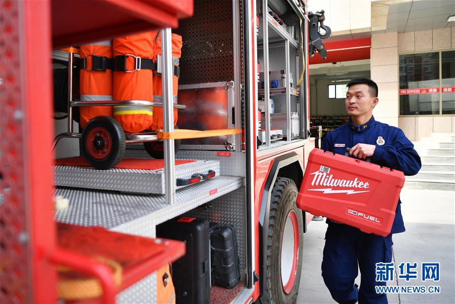 李志亮检查消防车上的消防救援装备(4月11日摄)。新华社记者 陈斌 摄