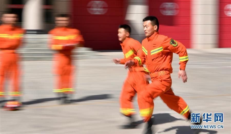 李志亮(右一)在中队训练场上进行体能训练(4月11日摄)。 新华社记者 陈斌 摄