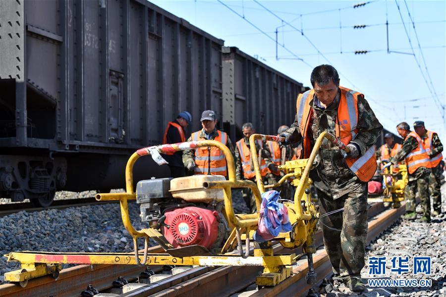 大同工务段的工人们在固定钢轨扣件(4月16日摄)。 近日,大秦铁路进入春季检修阶段,中国铁路太原局集团有限公司大同工务段的工人们加紧施工,确保列车的安全运行。 每年春、秋两季,大秦铁路都会迎来为期25天左右的“体检”。“体检”期间,全线路每天停运3小时,工人会进行更换伤损钢轨、夯实道床、清理淤积物等20余项施工作业。 大秦铁路西起大同韩家岭,东至秦皇岛柳村南,全长653公里,煤炭运量占全国铁路煤运总量的近1/5,是中国铁路重载领域的标志性工程。 新华社记者 曹阳 摄