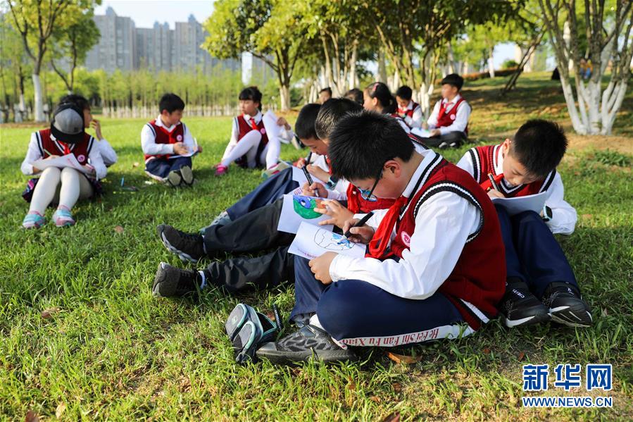 4月17日,参加活动的学生在描绘“我心中的地球”。 世界地球日来临之际,合肥市滨湖世纪社区在塘西河沙滩公园开展“善待地球 保护环境”主题活动。 新华社记者 曹力 摄