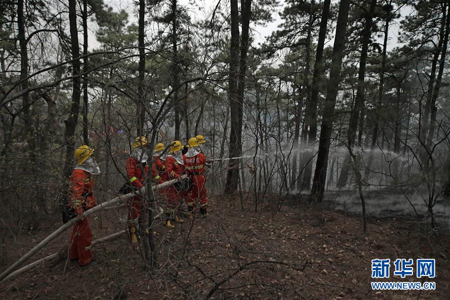 4月17日,消防人员在棋盘山火灾现场救火。 记者从沈阳市政府新闻办了解到,4月17日13时50分左右,沈阳市郊东部的棋盘山附近突发山火。记者下午赶至火灾现场时,仍看到滚滚浓烟和多处明火燃烧。为避免人员伤亡,当地有关部门迅速组织附近人员紧急撤离,警方对现场进行交通管制。 据介绍,目前,现场尚无人员伤亡报告,起火原因公安机关正在调查。 新华社记者 杨青 摄