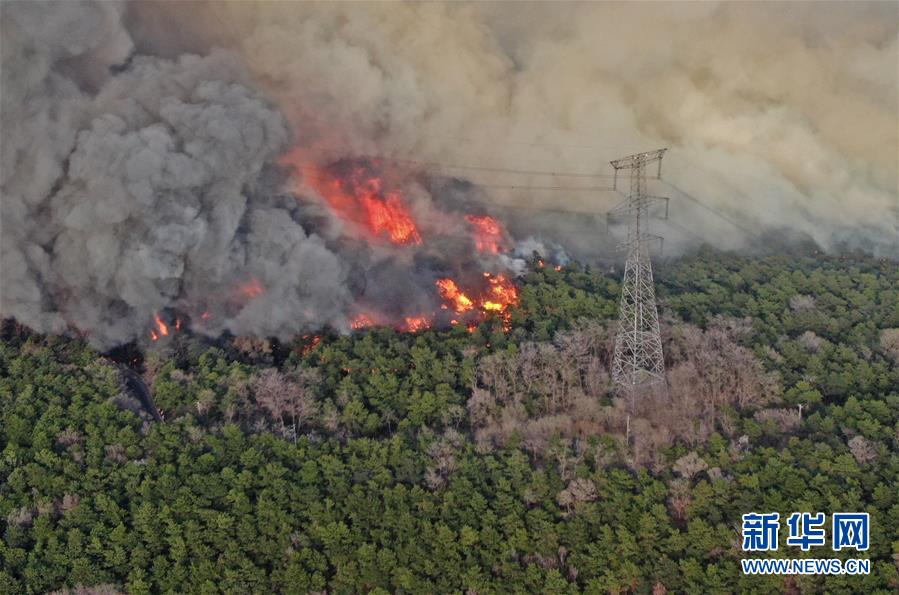 4月17日无人机拍摄的沈阳棋盘山火灾现场。 记者从沈阳市政府新闻办了解到,4月17日13时50分左右,沈阳市郊东部的棋盘山附近突发山火。记者下午赶至火灾现场时,仍看到滚滚浓烟和多处明火燃烧。为避免人员伤亡,当地有关部门迅速组织附近人员紧急撤离,警方对现场进行交通管制。 据介绍,目前,现场尚无人员伤亡报告,起火原因公安机关正在调查。 新华社记者 杨青 摄