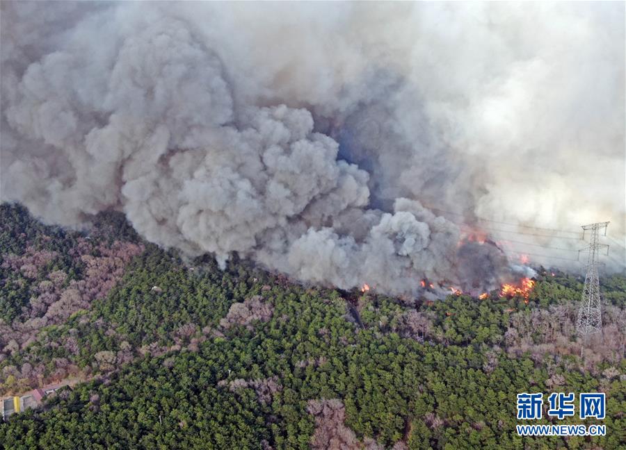 4月17日无人机拍摄的沈阳棋盘山火灾现场。 记者从沈阳市政府新闻办了解到,4月17日13时50分左右,沈阳市郊东部的棋盘山附近突发山火。记者下午赶至火灾现场时,仍看到滚滚浓烟和多处明火燃烧。为避免人员伤亡,当地有关部门迅速组织附近人员紧急撤离,警方对现场进行交通管制。 据介绍,目前,现场尚无人员伤亡报告,起火原因公安机关正在调查。 新华社记者 杨青 摄