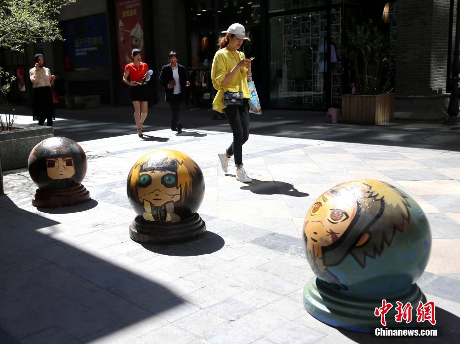 4月18日,路人从创意石墩旁走过。近日,西宁一商业区内的隔离石墩被美化成了一个个呆萌可爱的海绵宝宝、哆啦A梦、钢铁侠等动漫人物形象,创意十足。中新社记者 马铭言 摄