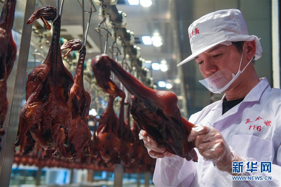 4月18日,徐杰在三珍斋食品有限公司车间内查看流水线上成品卤鸭的品质。 新华社记者 徐昱 摄