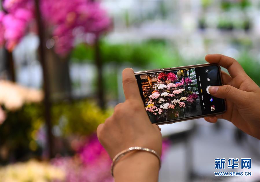 4月23日,参会人员用手机拍摄仿真花卉。 当日,第125届中国进出口商品交易会(广交会)第二期在广州琶洲会展中心开幕。本期展会将持续至4月27日,主要展出日用消费品、礼品、家居装饰品等。 新华社记者 邓华 摄