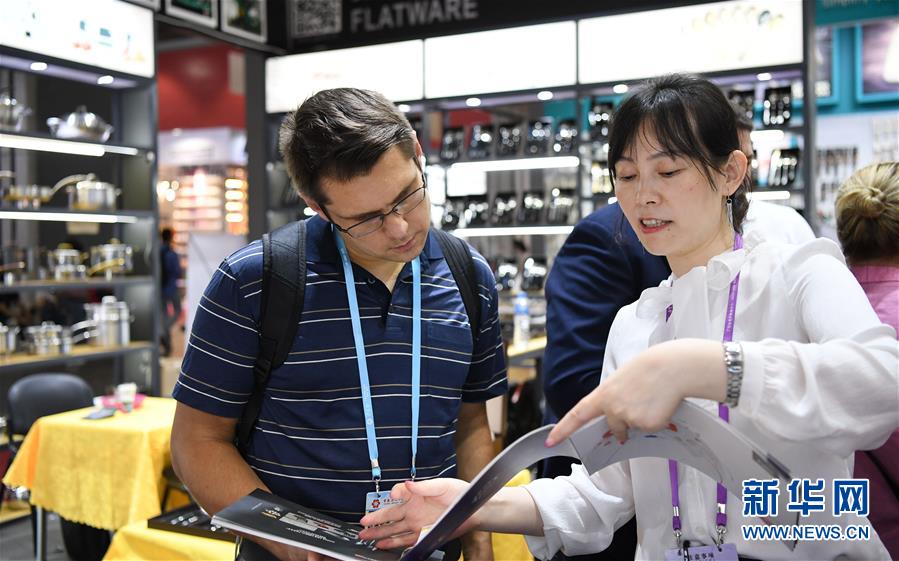 4月23日,在厨具展区,外国采购商和参展商洽谈。 当日,第125届中国进出口商品交易会(广交会)第二期在广州琶洲会展中心开幕。本期展会将持续至4月27日,主要展出日用消费品、礼品、家居装饰品等。 新华社记者 邓华 摄