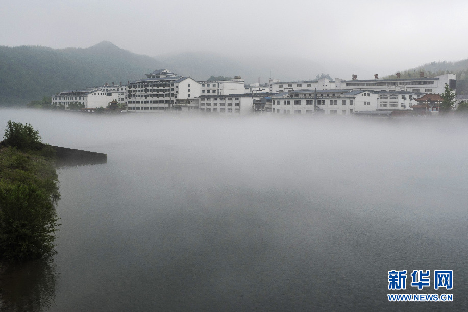 4月23日,东淠河上现平流雾景观。新华网发(徐程 摄)