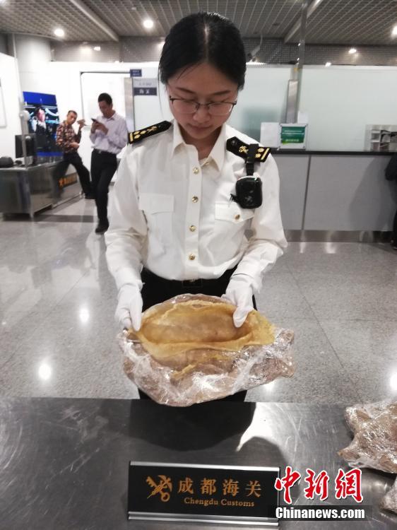 4月24日,成都海关在成都双流国际机场机场截获一批鱼鳔。成都海关在对由首尔入境的航班进行查验中,在一名中国籍旅客两个托运行李箱内查获疑似加湾石首鱼鱼膘共计91个,毛重31.7千克,案值约1164万元人民币,这是该口岸查获最大一起走私濒危动植物种入境案件。图为成都海关查获的石首鱼鱼鳔。中新社发 成都海关供图