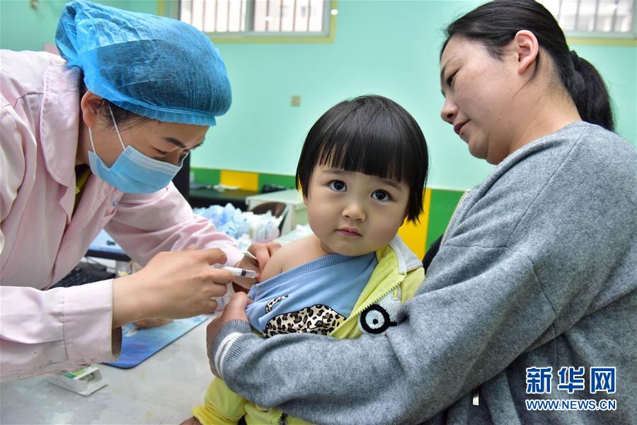 4月25日,在河北省新乐市疾病预防控制中心,医护人员为儿童接种疫苗。 当日是全国儿童预防接种日。 新华社发(贾敏杰 摄)