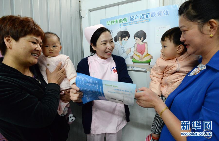 4月25日,河北省邯郸市峰峰矿区妇幼保健院的医护人员为幼儿家长讲解预防接种知识。 当日是全国儿童预防接种日。 新华社发(郝群英 摄)