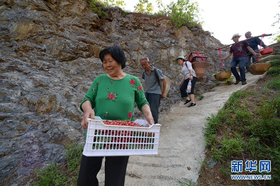 4月26日,村民在大方县对江镇营兴村樱桃园里搬运采摘的樱桃。 近日,贵州省毕节市大方县对江镇营兴村的500余亩樱桃成熟,进入最佳采摘期。 近年来,大方县因地制宜引导农民利用荒山发展樱桃等经果林的种植,既起到了保土、保水的作用,又推动了当地种植业的发展。 新华社记者 杨楹 摄