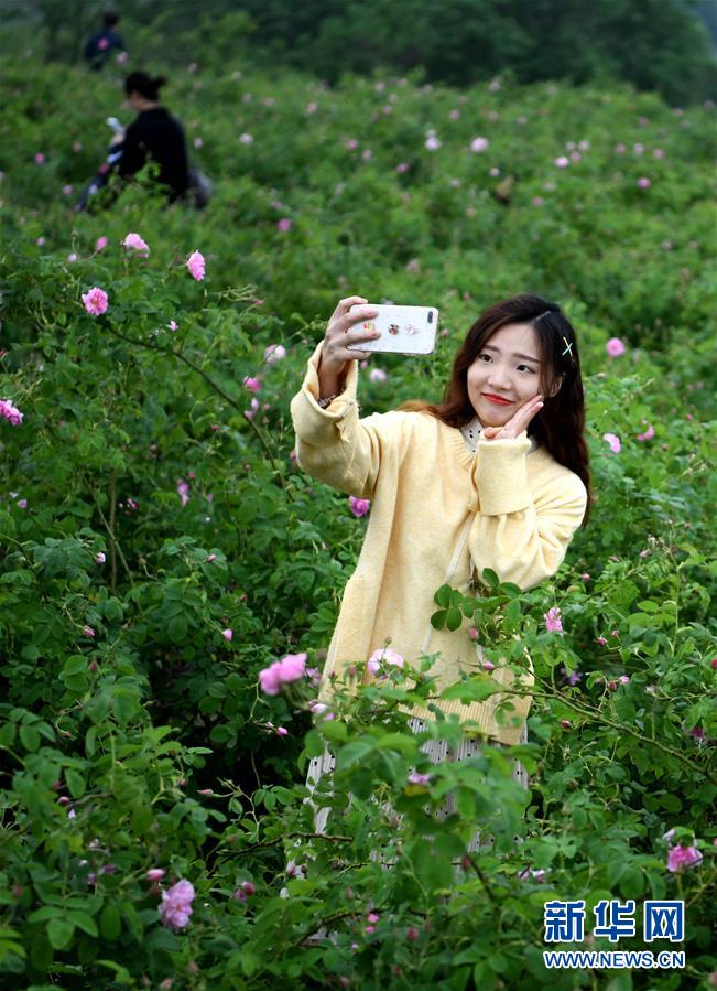 4月28日,游客在紫蓬镇新农村的玫瑰花种植园内拍照。 近年来,安徽省肥西县紫蓬镇积极调整农业产业结构,发展以玫瑰花种植及深加工为特色的生态休闲农业,以花为媒,助力乡村振兴。 新华社记者 刘军喜 摄