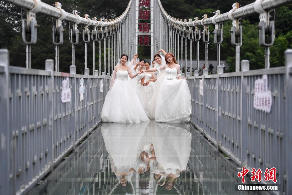 基层劳动者们在玻璃桥拍起了婚纱照。 杨华峰 摄