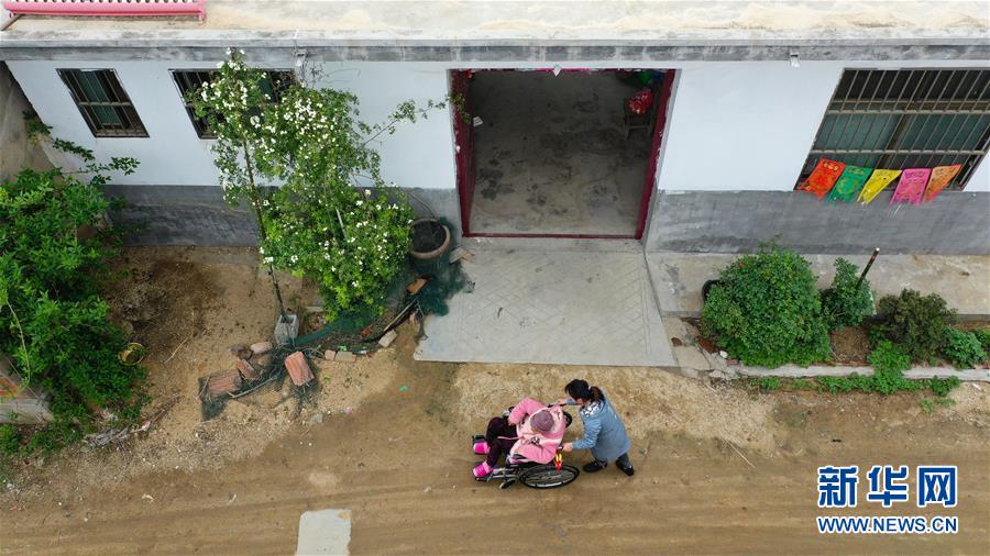 殷自玉推着母亲刘吉花出家门散心(4月24日无人机拍摄)。 新华社记者 季春鹏 摄