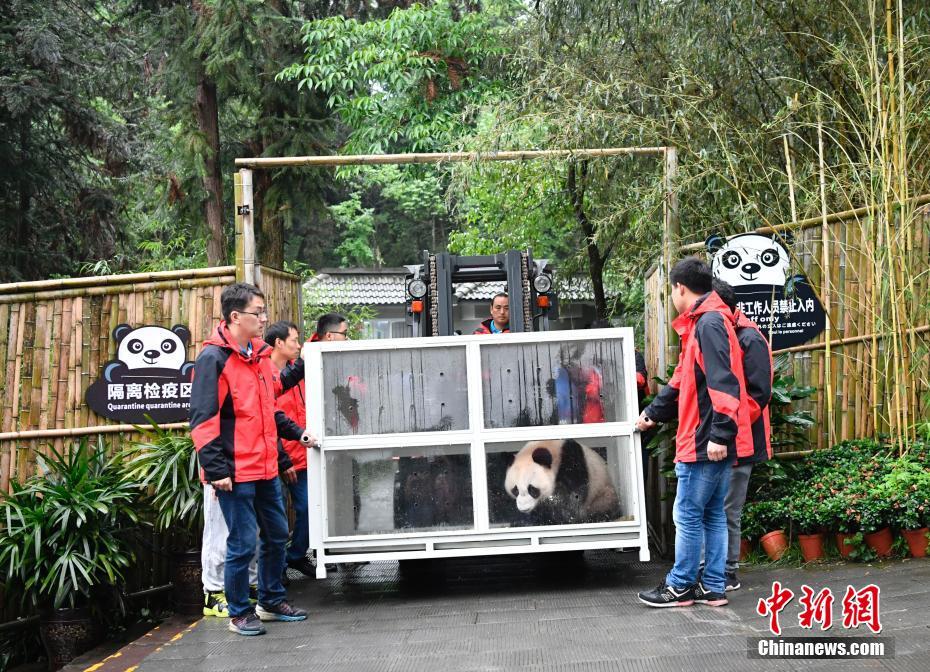 工作人员将大熊猫“丁丁”从隔离检疫兽舍转运出来。 安源 摄