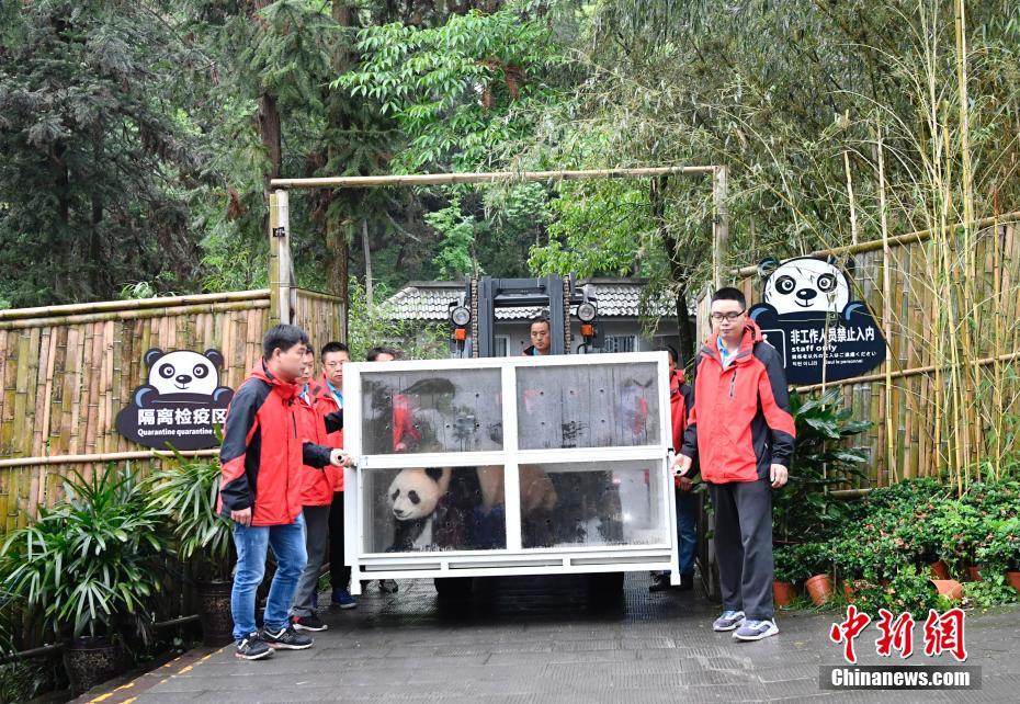 工作人员将大熊猫“如意”从隔离检疫兽舍转运出来。 安源 摄