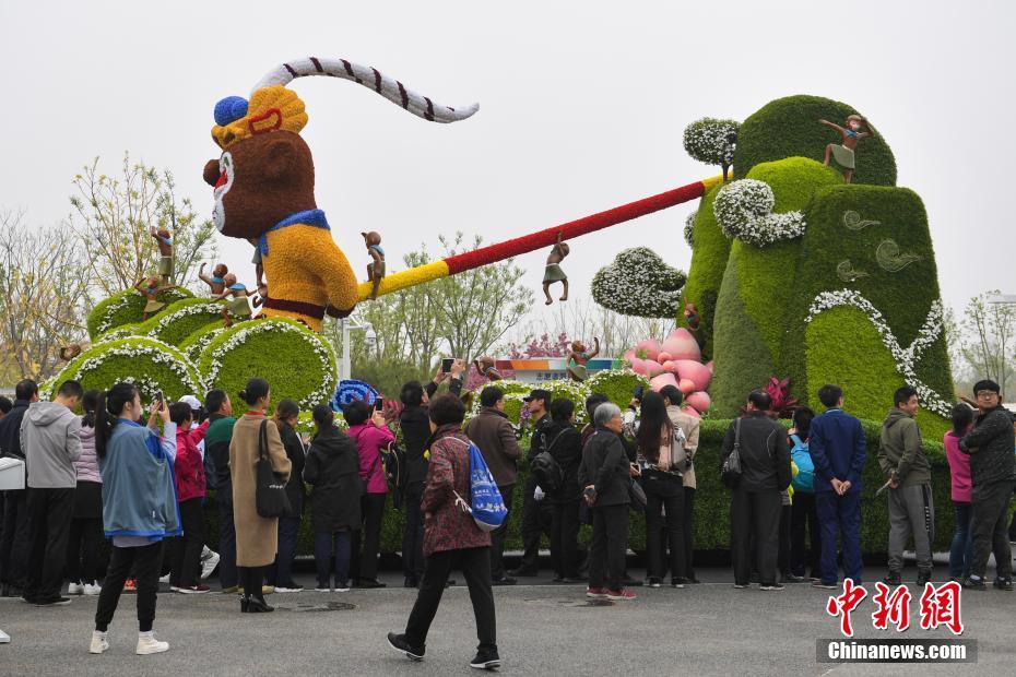 4月29日,2019年中国北京世界园艺博览会(简称北京世园会)正式对公众开放。图为参观民众观赏花车巡游表演。中新社记者 崔楠 摄