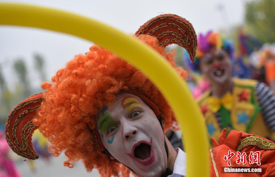 4月29日,2019年中国北京世界园艺博览会(简称北京世园会)正式对公众开放。图为一名小丑装扮的演员在国际风采嘉年华活动中表演。中新社记者 崔楠 摄