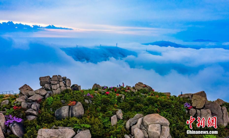 近日,航拍江西省新干县燥石景区的壮观云海,岩石上盛放的杜鹃,与风电塔组成一幅壮美的画卷,在蓝天的映衬下格外美丽。进入四月以来,江西省新干县燥石景区才地岩山杜鹃次第开放。因受气温回暖的影响,今年燥石杜鹃比往年提前了约十多天盛开。李小明 摄