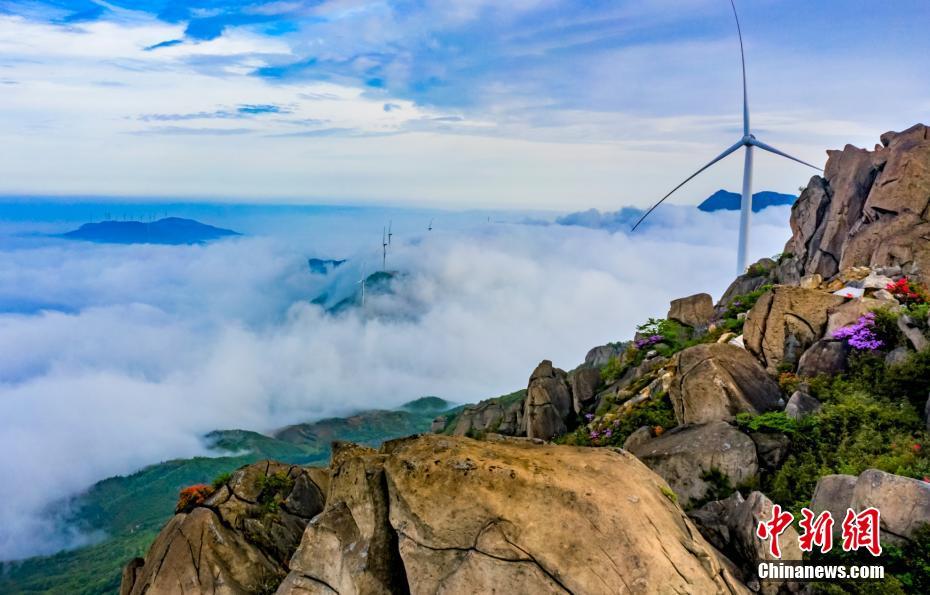 盛放的杜鹃与风电塔组成一幅壮美的画卷。岩石上盛放的杜鹃,在蓝天的映衬下格外美丽。 李小明 摄