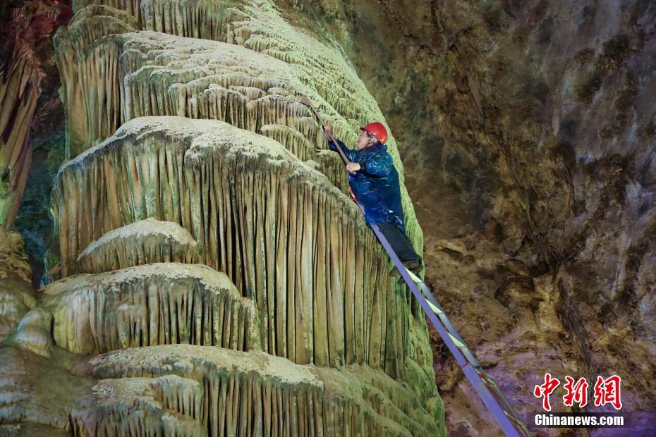 4月29日,五一假期将至,河南洛阳鸡冠洞景区,工作人员对溶洞内的亿年钟乳石进行清洗保养维护。据介绍,河南洛阳鸡冠洞是一座典型的石灰岩溶洞,形成时间达亿年之久,洞内钟乳石千姿百态,景观林立,有着极高的观赏价值和科研价值,被誉为“北国第一洞”。中新社记者 王中举 摄